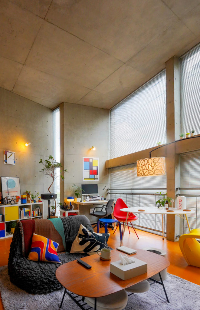 部屋自体はコンクリート打ちっぱなしで無機質ですが、ポップな色使いで冷たい印象を明るく
